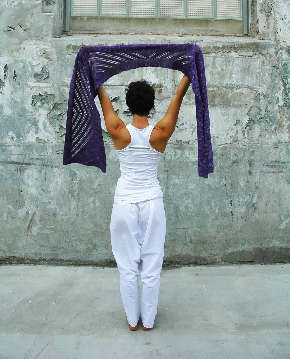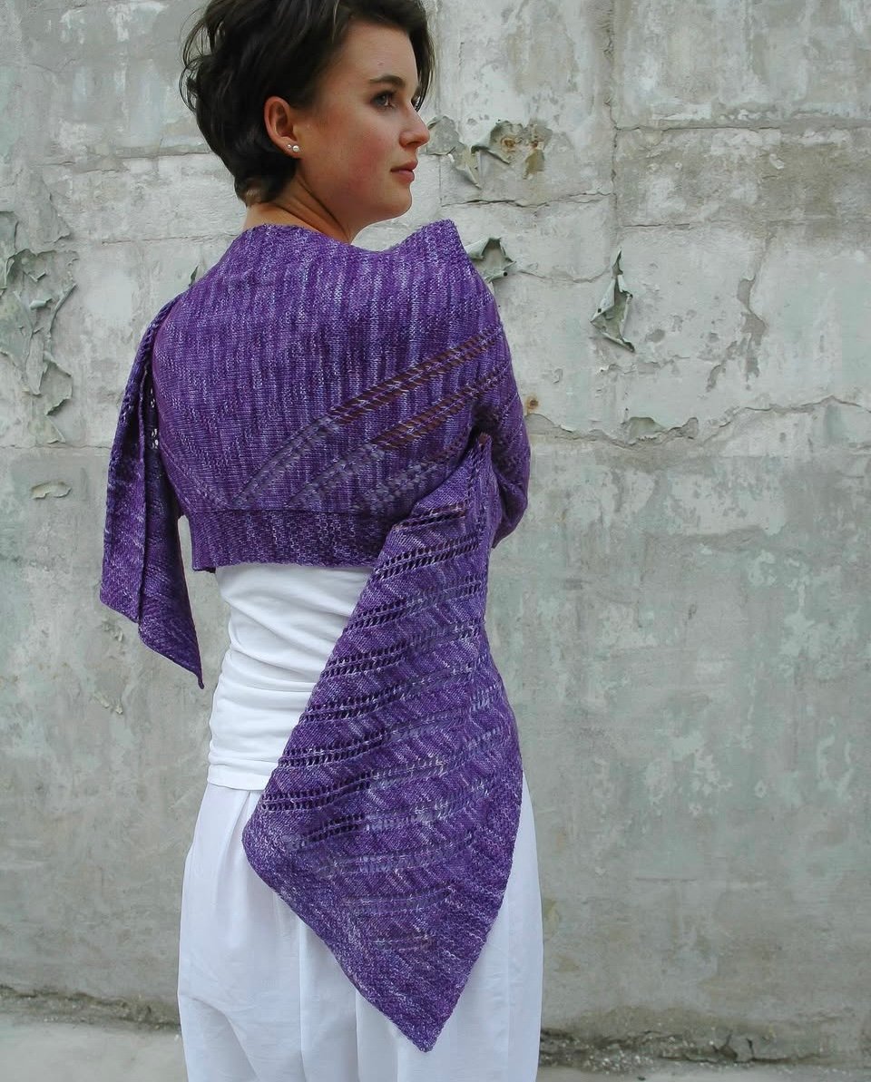 Der rechteckige Schal wird in Hin- und Rückreihen in Abschnitten mit einem einfachen Lace- und Strukturmuster gearbeitet. Das Design ist erstmals 2018 im Heft „Artlana anders“ erschienen.