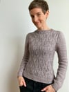 Du strickst Through the Grapevine als Top / Sweater in einem Stück, nahtlos von oben nach unten in Runden. Du beginnst mit einem provisorischen Anschlag am Hals, Schultern, Ärmel und Passe formst Du mit ganz einfachen Zunahmen. Nach der Passe trennst Du die Ärmel vom Körper und strickst alle Teile separat fertig. Das Grapevine Muster mit den dekorativen Zöpfchen am Vorderteil kannst Du nach einer ausführlichen, ausgeschriebenen Anleitung oder detaillierten Charts für Deine individuelle Größe einarbeiten. Ärmel- und Halsausschnitt bekommen einen I-Cord-Abschluss.