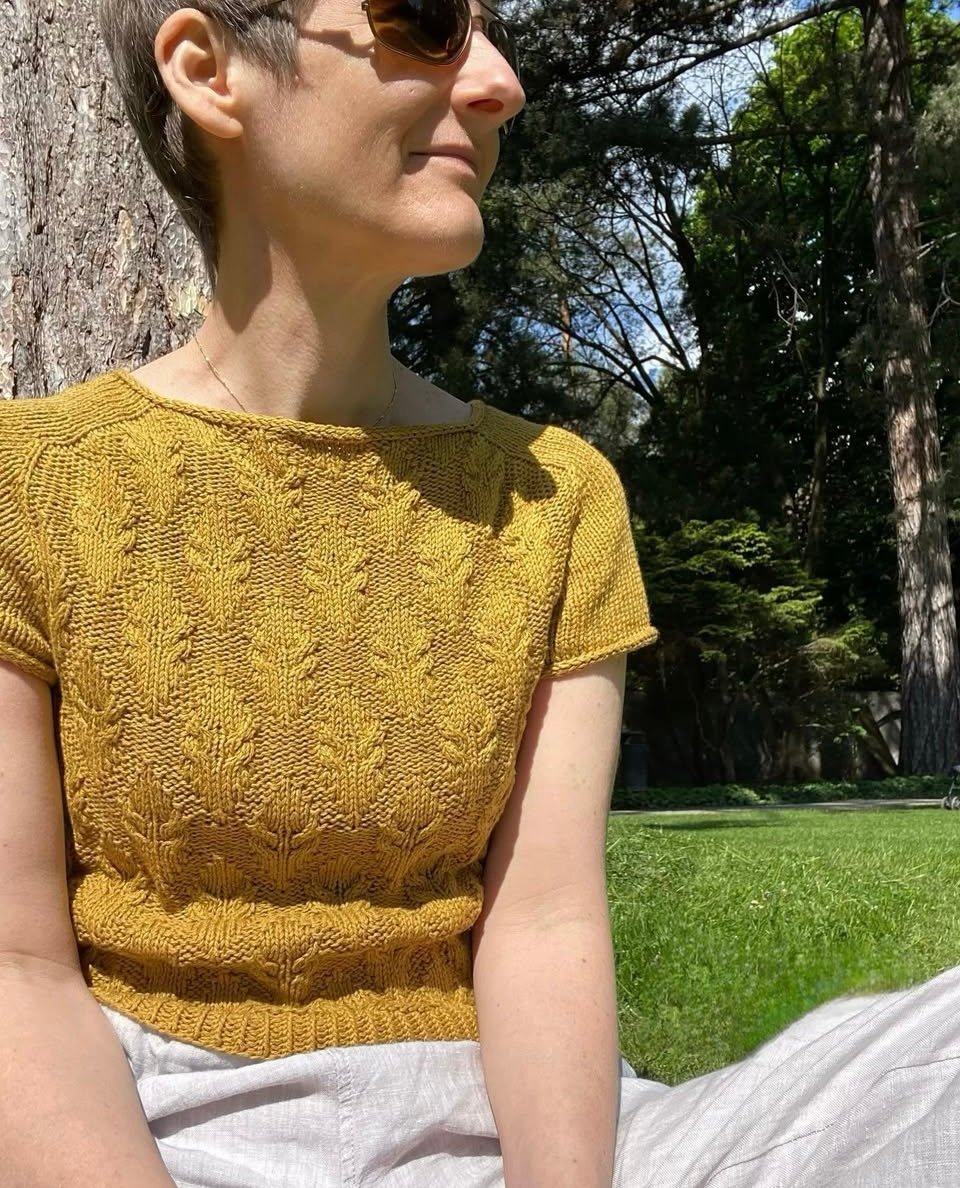 The top/sweater is worked in one piece, seamless from top to bottom, in rounds with saddle shoulders. Shoulders, sleeves and yoke are created by simple increases. After finishing the yoke, the sleeves are separated from the body and all parts are finished separately. On the front, the leaf pattern is worked in. You will detailed, written instructions as well as charts. Both can be downloaded separately for your respective size.