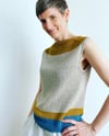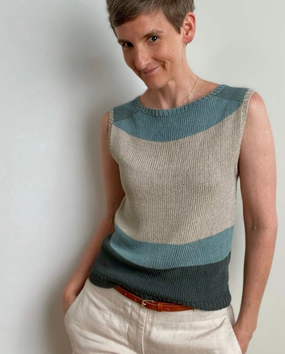 You will work the Straight Forward Top seamlessly from top to bottom. You start in the round with a boat neckline, and shape the shoulders with simple increases. For the yoke, you will separate back and front and knit both pieces separately in rows before joining both pieces again to complete the body in the round. You finish the armhole and body with a ribbed cuff. You can work the top in one color or striped, just as you please or whatever your stash allows. The instructions include detailed, written step by step instructions on how to recreate the piece with numerous useful tips and hints for adjustments.